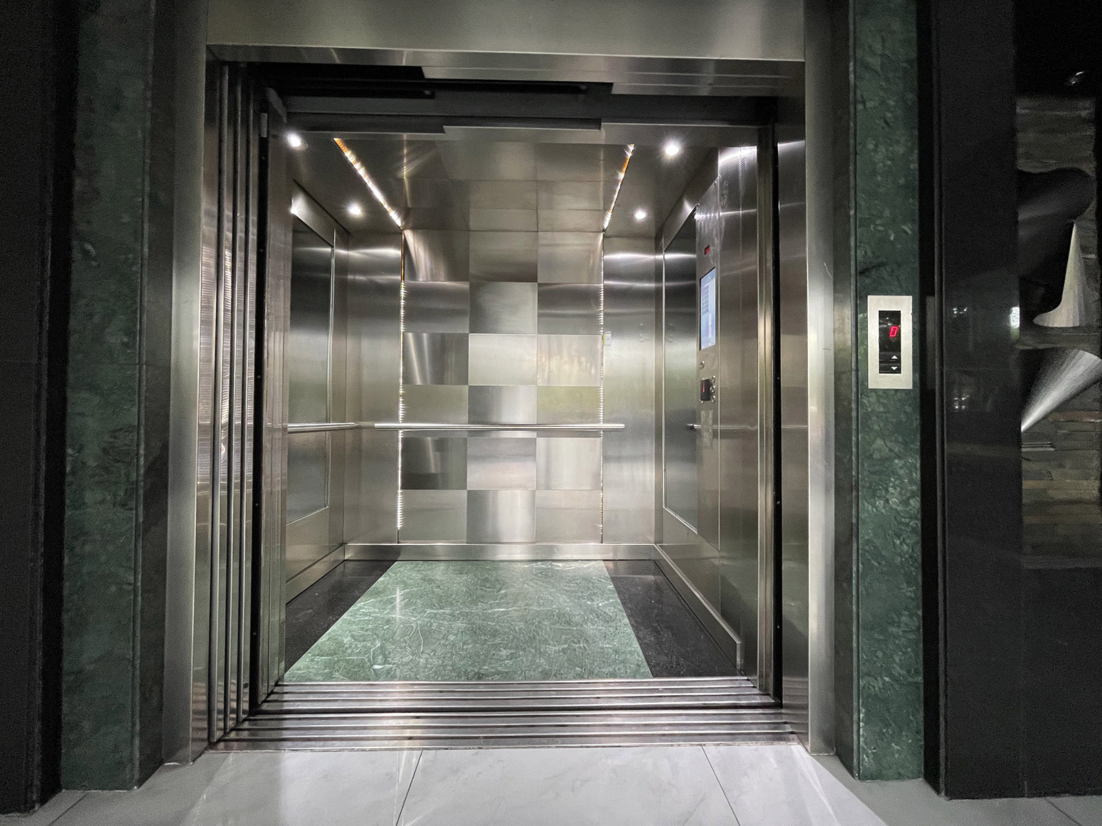 Ascensor de servicio: con paneles y cielorraso en acero inoxidable, detalles calados y luces interiores que generan un ambiente moderno y elegante.