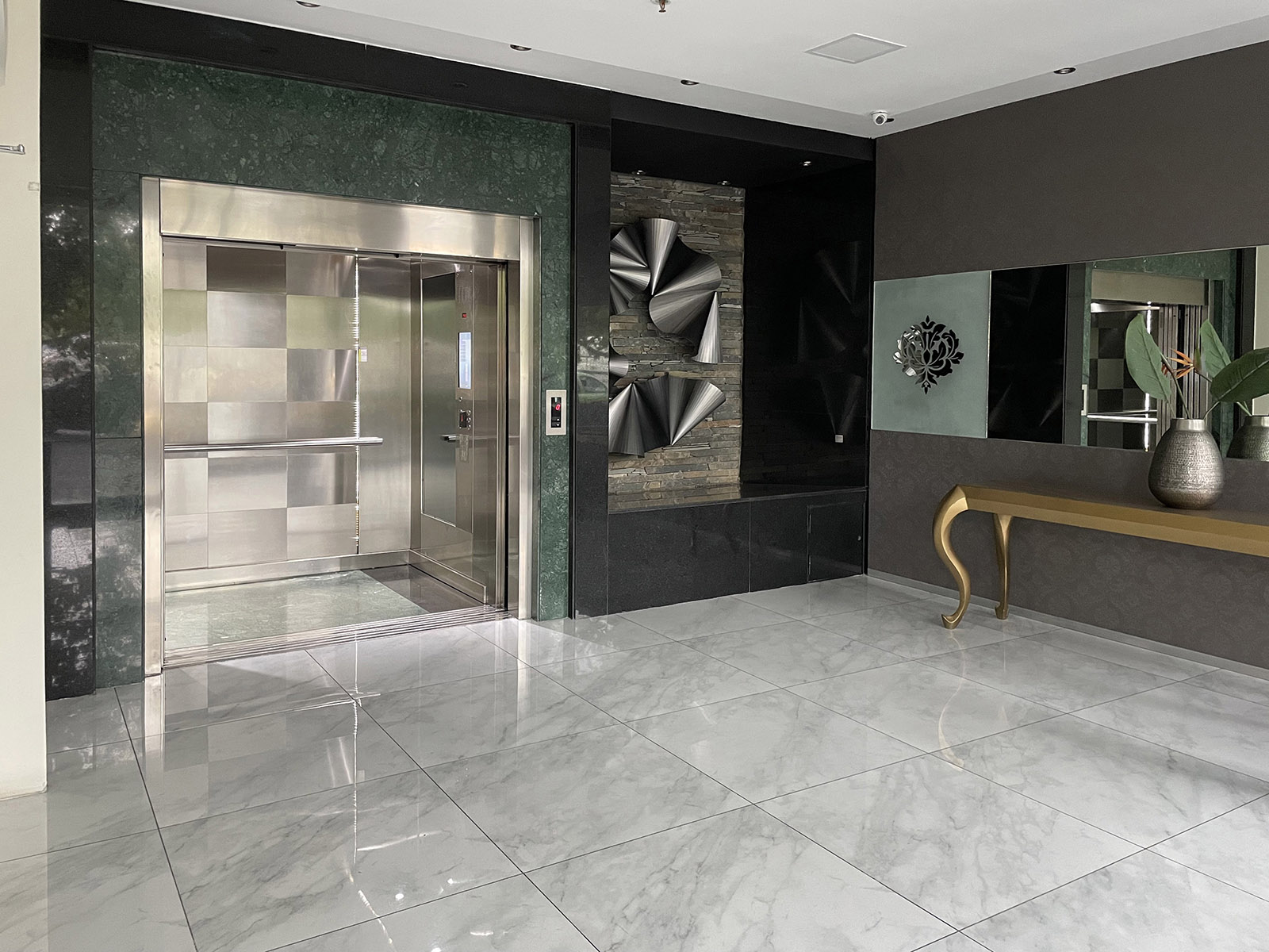 Ascensor principal: de gran capacidad, con cabina de diseño personalizado. Sus paneles de acero en damero y la iluminación LED rasante realzan la estética y aportan sofisticación al espacio.